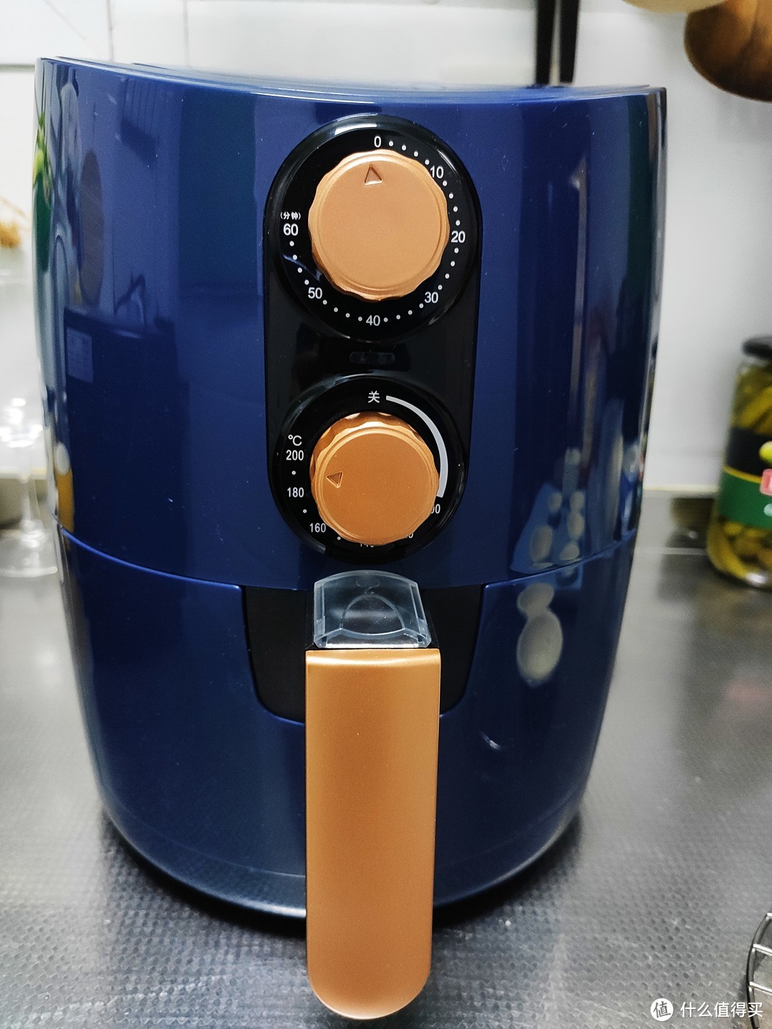 大多数空气炸锅外观样式都是差不多的,我选择的是最简单空气炸锅款式,电饭锅一样的圆柱形锅身,时间和温度两个调节旋钮,一个食物篮。之所以选择功能简单的款也是觉得越简单一般越禁得住用,而且方便老人操作。